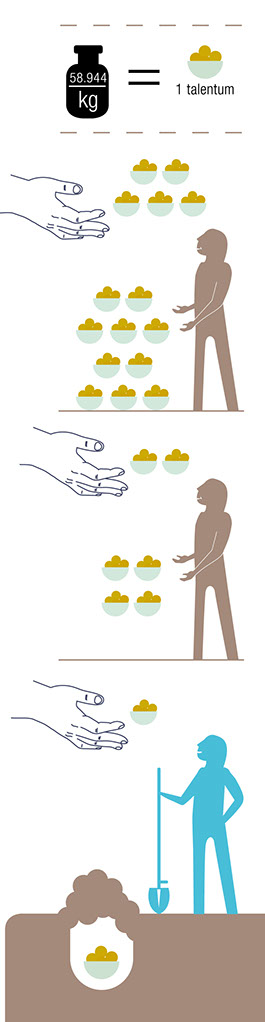 „Mert úgy van ez, mint amikor egy idegenbe készülő ember hívatta szolgáit, és rájuk bízta vagyonát. Az egyiknek adott öt talentumot, a másiknak kettőt, a harmadiknak pedig egyet, kinek-kinek képessége szerint, és elment idegenbe. Az, aki az öt talentumot kapta, azonnal elindult, vállalkozásba fogott vele, és másik ötöt keresett hozzá. Ugyanígy a két talentumos is másik kettőt keresett hozzá. Aki pedig az egyet kapta, elment, gödröt ásott a földbe, és elrejtette ura pénzét. Hosszú idő múlva azután megjött ezeknek a szolgáknak az ura, és számadást tartott velük. Eljött az, aki az öt talentumot kapta, hozott másik öt talentumot, és így szólt: Uram, öt talentumot bíztál rám: nézd, másik öt talentumot kerestem. Ura így szólt hozzá: Jól van, jó és hű szolgám, a kevésen hű voltál, sokat bízok rád ezután, jöjj, és osztozz urad örömében! Eljött az is, aki a két talentumot kapta, és ezt mondta: Uram, két talentumot bíztál rám: nézd, másik két talentumot kerestem. Ura így szólt hozzá: Jól van, jó és hű szolgám, a kevésen hű voltál, sokat bízok rád ezután, jöjj, és osztozz urad örömében! És amikor eljött az, aki az egy talentumot kapta, ezt mondta: Uram, tudtam, hogy könyörtelen ember vagy, aki ott is aratsz, ahol nem vetettél, és onnan is gyűjtesz, ahová nem szórtál. Félelmemben elmentem tehát, és elástam a talentumodat a földbe: nézd, itt van az, ami a tied. Ura így válaszolt neki: Te gonosz és rest szolga, tudtad, hogy ott is aratok, ahol nem vetettem, és onnan is gyűjtök, ahova nem szórtam? Ezért el kellett volna vinned a pénzemet a pénzváltókhoz, és amikor megjöttem, kamatostul kaptam volna vissza azt, ami az enyém. Vegyétek el tőle a talentumot, és adjátok annak, akinek tíz talentuma van!” (Mt 25,14–28)